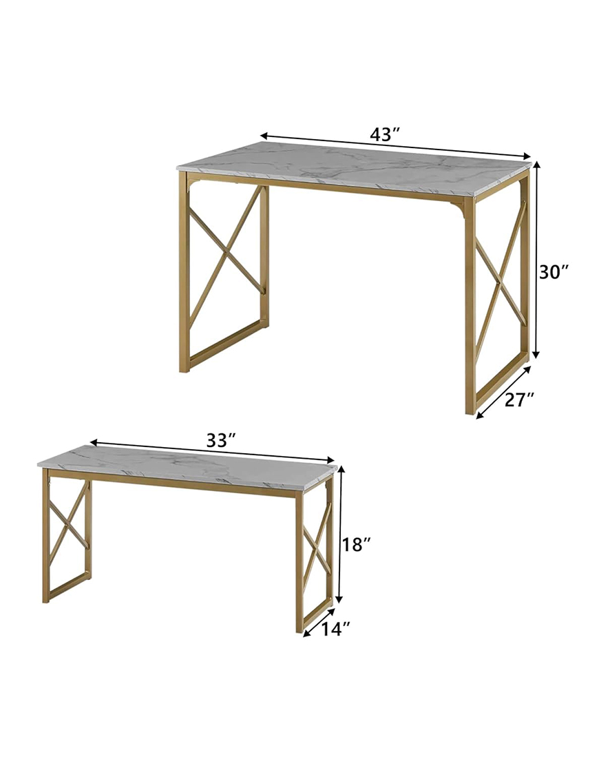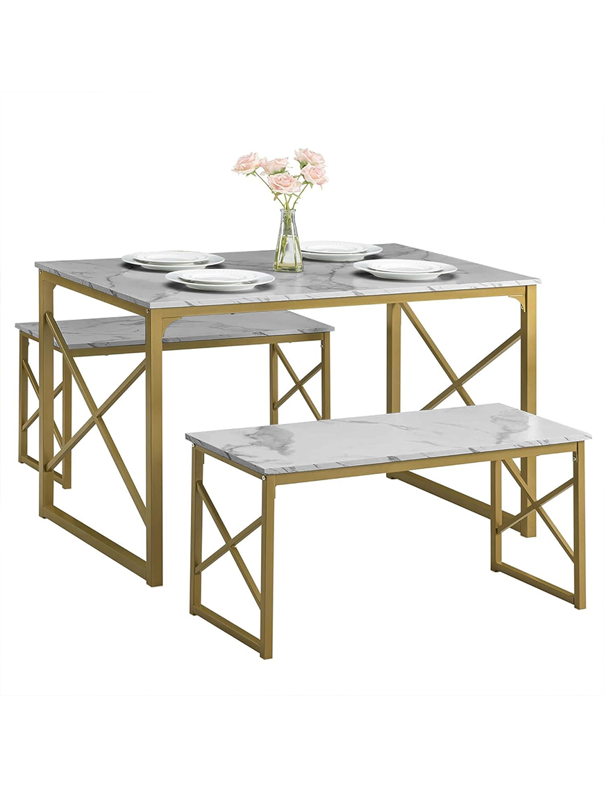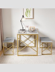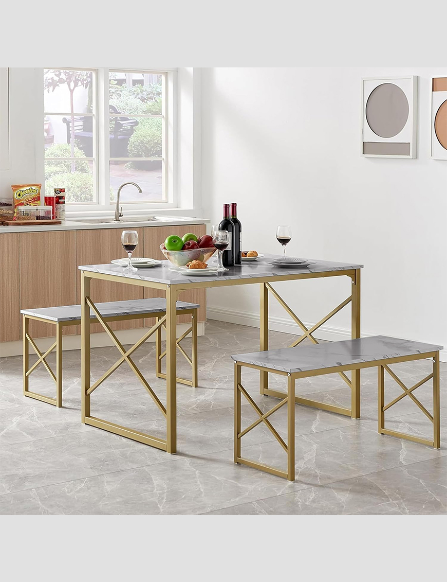 Elevate your dining or workspace with this luxurious 3-piece dining table set, featuring a sleek marble-finish tabletop and elegant gold metal frame. Designed for style and functionality, this set includes a rectangular table and two matching benches, perfect for small spaces, apartments, or contemporary interiors.